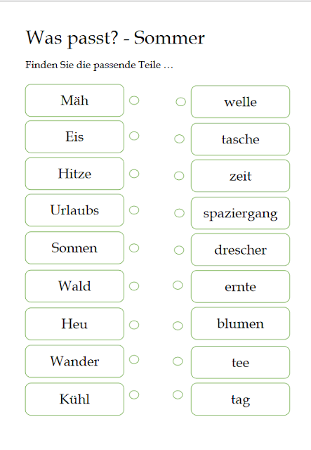 Was passt? - Gegenstände und Ihre Teile Information zur Umsetzung: Diese Einheit ist aus dem klassischen Bereich, wo man auf jeder Seite des Arbeitsblattes ein Teil eines ganzen Wortes steht und mit dem Teil auf der anderen Seite richtig verbunden werden soll. Eckdaten zur Aktivierung: Passt: Gedächtnistraining Inhalt: 9 Arbeitsblätter Dauer: 10 Minuten (je Blatt) Schwierigkeit: Normal PDF Datei zum Ausdrucken Für Mitglieder von Steady in der Übersicht Was passt? - Suchrätsel